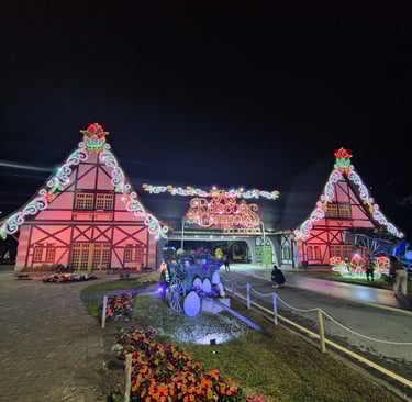 Portal de Entrada: O receptivo da cidade já está todo iluminado! Com assinatura da renomada Brunete Fraccaroli, o portal ganhou arabescos em LED, coelhos gigantes e jardins lúdicos que são o cenário perfeito para fotos.